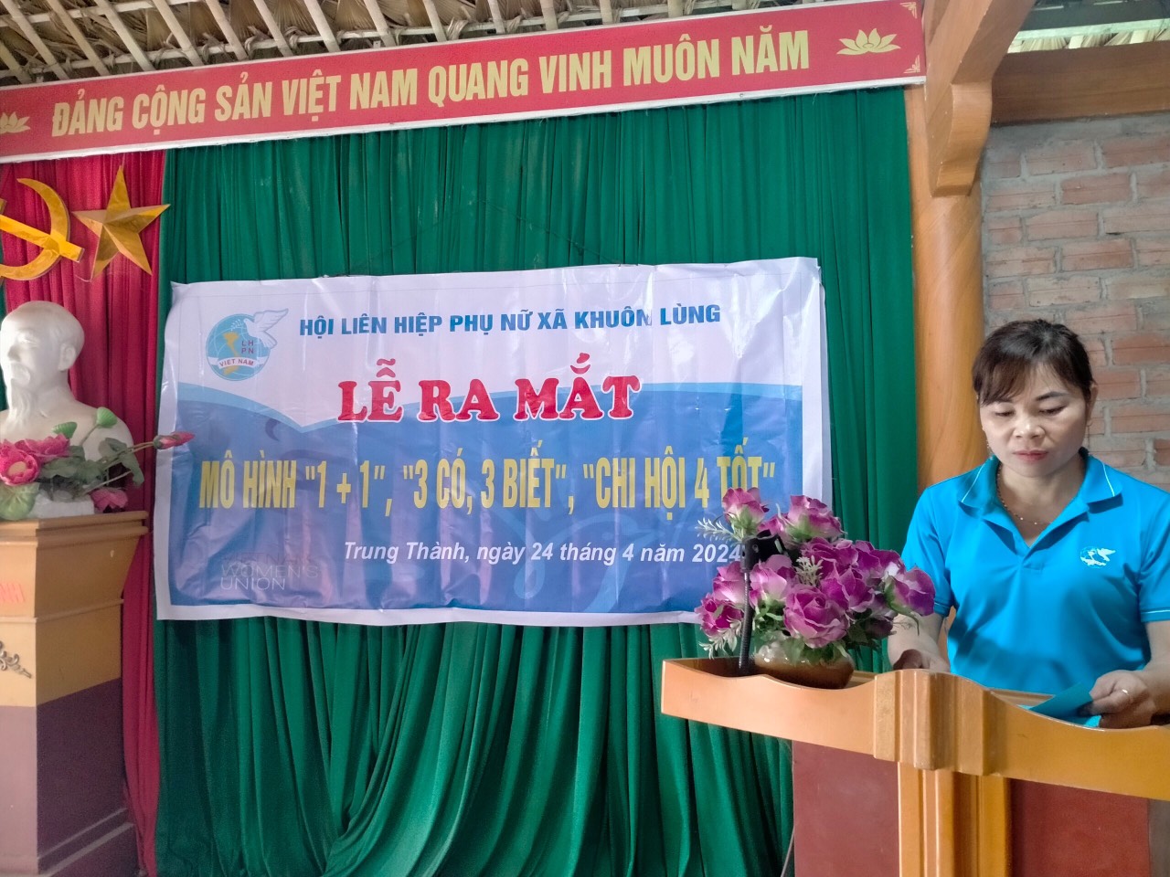 Ngày 24/4/2024 Hội LHPN xã Khuôn Lùng (Xín Mần) tổ chức ra mắt mô hình“1+1”, “3 có, 3 biết” và mô hình “Chi hội 4 tốt” tại chi hội phụ nữ thôn Trung Thành xã Khuôn Lùng. Tới dự buổi ra mắt có đồng chí Hoàng Thị Dưa - Đảng ủy viên, chủ tịch Hội LHPN xã và các đồng chí UVBCH Hội LHPN xã cùng 25 chị em hội viên phụ nữ thôn Trung Thành. Phát biểu tại buổi lễ ra mắt đồng chí Hoàng Thị Dưa - Chủ tịch Hội LHPN xã nhấn mạnh 03 nội dung sau: