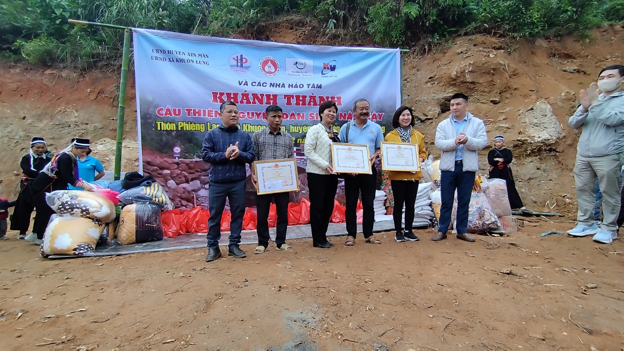 Ảnh: Đ/c Bùi Xuân Trung - Bí thư Đảng ủy, Chủ tịch HĐND xã (Trái) và đ/c Nguyễn Thế Hệ - PBT, Chủ tịch UBND xã Khuôn Lùng (Phải) trao giấy khen của UBND xã Khuôn Lùng cho đại diện nhà hảo tâm và nhân dân thôn Phiêng Lang đã có thành tích trong việc xây dựng cây cầu dân sinh Nậm Cậy