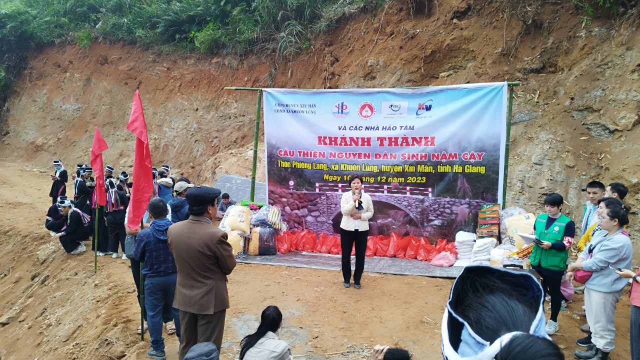 Ảnh: Đại diện đoàn từ thiện phát biểu tại buổi lễ khánh thành cầu
