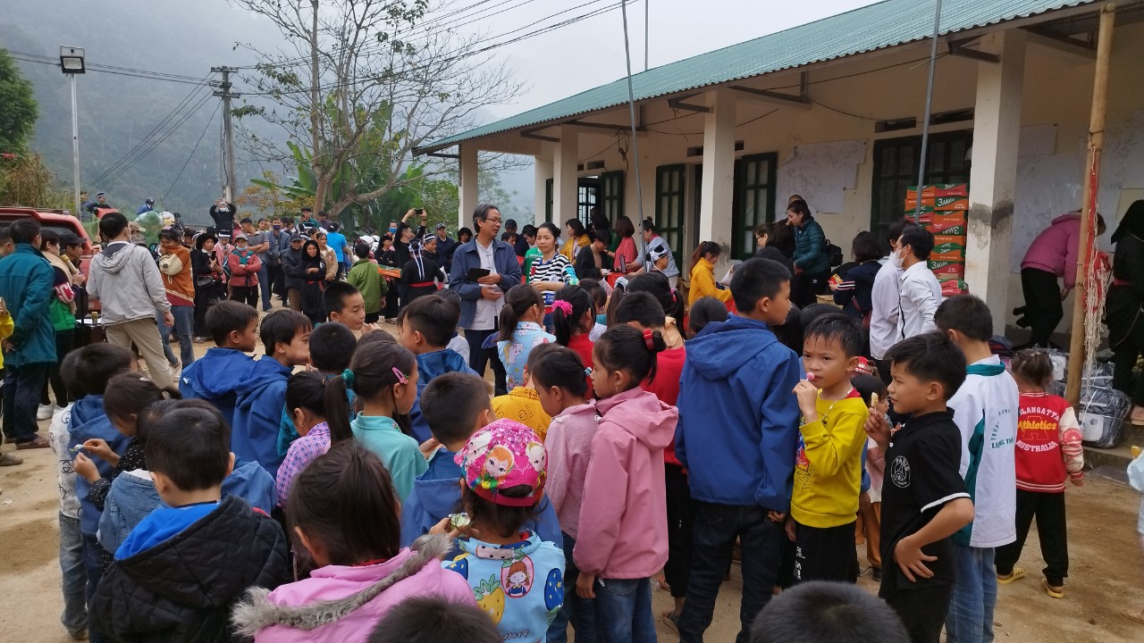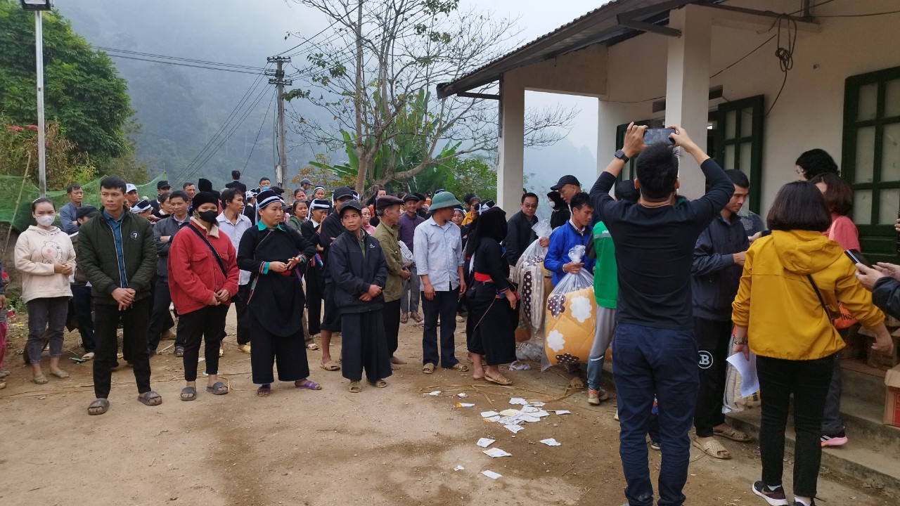 Buổi lễ cắt băng khánh thành cầu dân sinh Nậm Cậy kết thúc, đoàn từ thiện tiến hành phát quà cho các hộ dân và các cháu học sinh của thôn Phiêng Lang./.